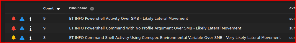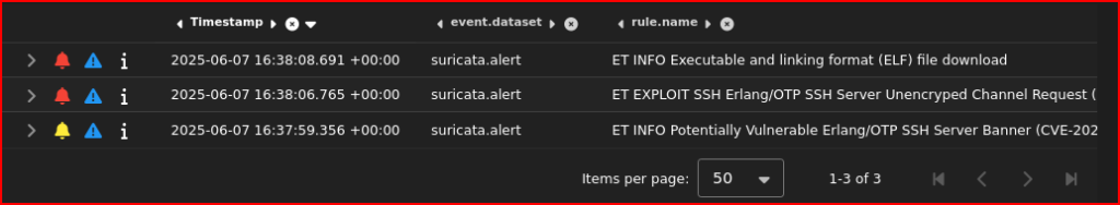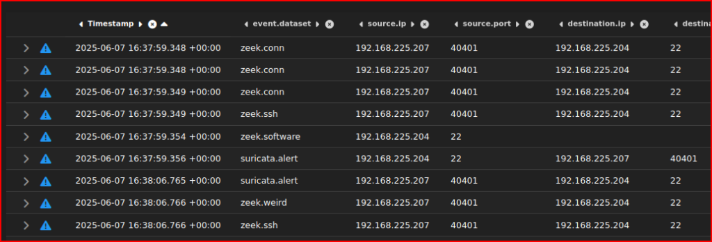 We first see the ssh exploitation in this events list with the attacker IP address interacting with our victim over port 22.