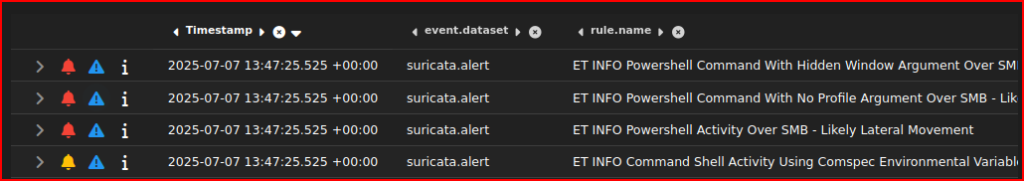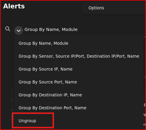 I am given a date stamp for this exploit but looking at Security Onion’s Alert menu there are no Date Stamp listed there. Everything is grouped by the name of the alert and the name of the module that triggered the alert: