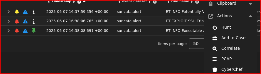 Now, I have to identify the stage 2 executable download. After the adversary successfully exploited the SSH service, they usually want to expand their capabilities to. Pushing an executable to a compromised box that could do C2 and persistence or keystroke logging, is one of the ways for attacker to achieve this goal. The third rule in Security Onion is called ET info Executable. Expanding this rule, I see the same IPs involved but it is a different session from the first two rules (the source and destination port numbers are different). To look at the packet itself, I can left-click on the alert, click on the Actions menu and select PCAP: