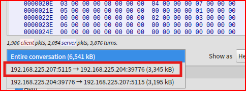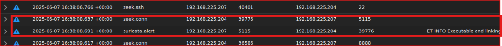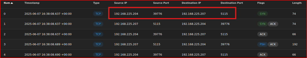 We see the victim IP address (192.168.225.204) reaching out to the attacker IP address on an unexpected port (5115)