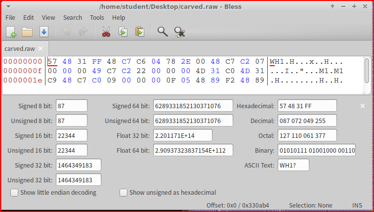 All the data in this file is not of interest as we only care about carving the executable. We can use Bless to remove the data located before the executable.