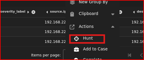 The lab’s last question is regarding the identification of C2 traffic. I am looking for communication during this same time frame. This network traffic was not associated with an actual alert. Once thing I can use in Security Onion that could help with this is the Hunt menu. If I left-click on the victim IP address, select action and click Hunt: