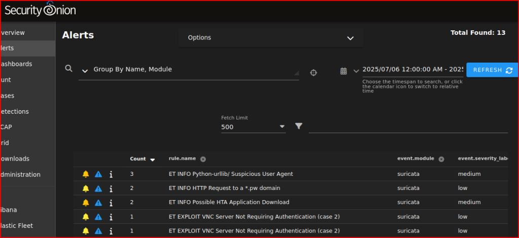 I am going to use the time stamp provided in the Alert menu of Security Onion. We have total of 13 alerts that were generated on this date: