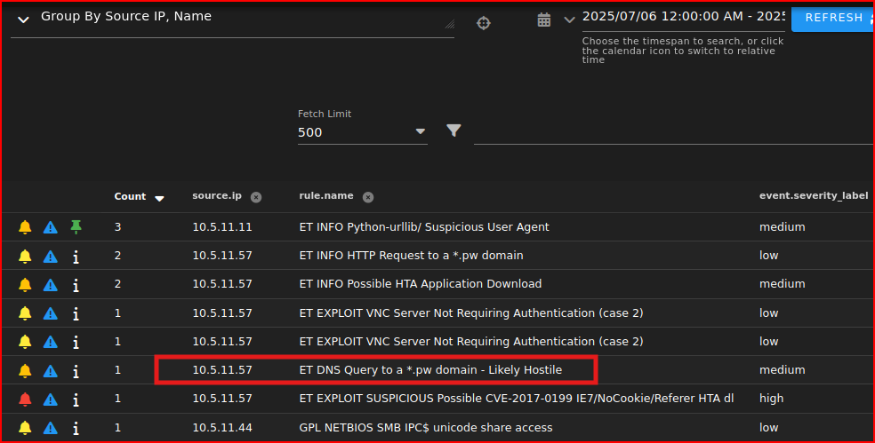 I first group these alerts by source IP address. One line that attracts my interest right away is the ET DNS query made from the PC that was described as acting weird: