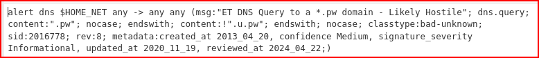 The rule is looking for dns queries to top level domain ‘.pw’ but not ‘.u.pw’. This is a pretty weak match as this TLD is not always necessarily evil. The actual DNS query made is:
