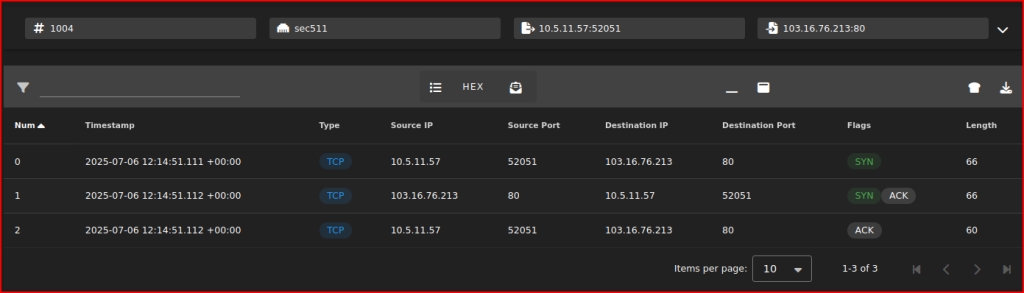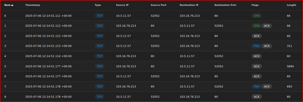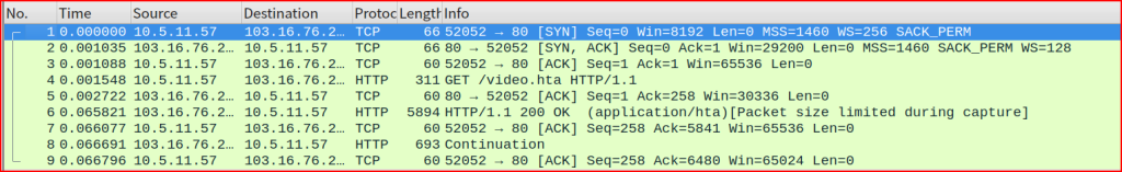 First, we see the DNS request from 10.5.11.57. Then we see the reach out to the IP address that I am interested in. Looking at the socket pairs, I see 3 subsequent sessions. The client has interacted multiple times in a row with the same system. Let’s look at the packet for the first session corresponding to the socket pairs (52051-80). This is just a handshake (Syn, Syn/Ack, Ack) with nothing else going on after that: